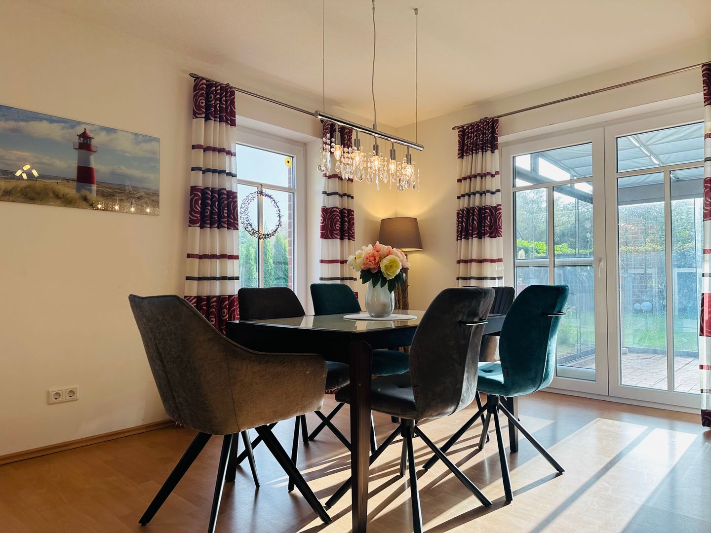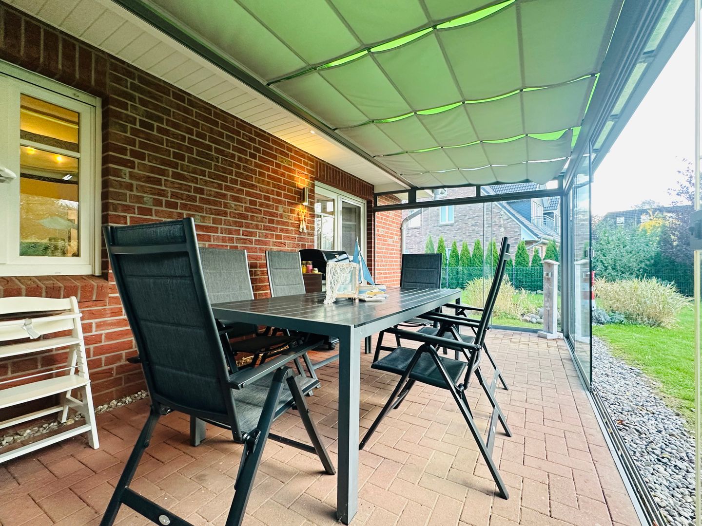 Ein besonderes Highlight ist der lichtdurchflutete Wintergarten mit Südwest-Ausrichtung. Hier genießen Sie auf dem großzügigen Sitzbereich oder im Strandkorb die Sonne – perfekt, um den Tag bei einer Tasse Kaffee oder einem Glas Wein ausklingen zu lassen.