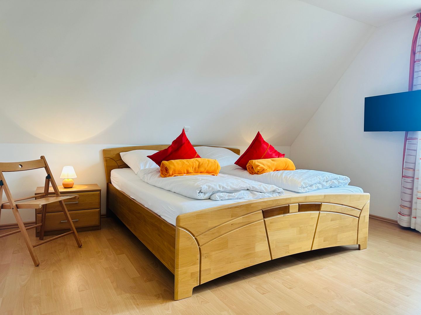 Im Obergeschoss befindet sich ein Schlafzimmer mit Fernseher und Kleiderschrank.