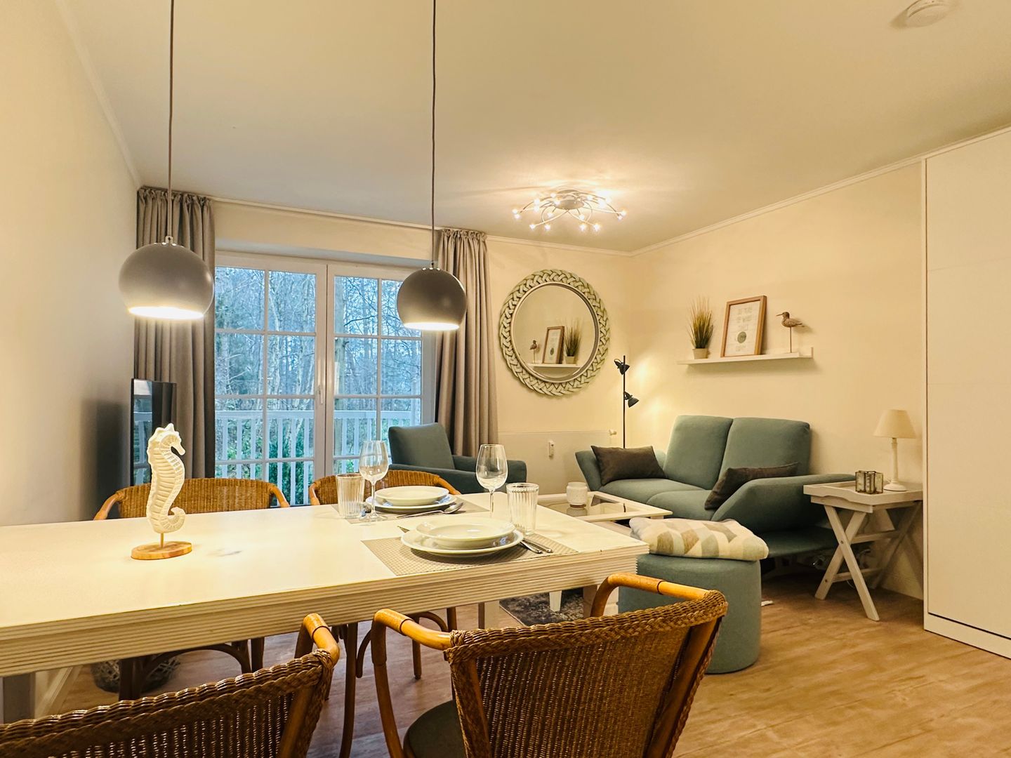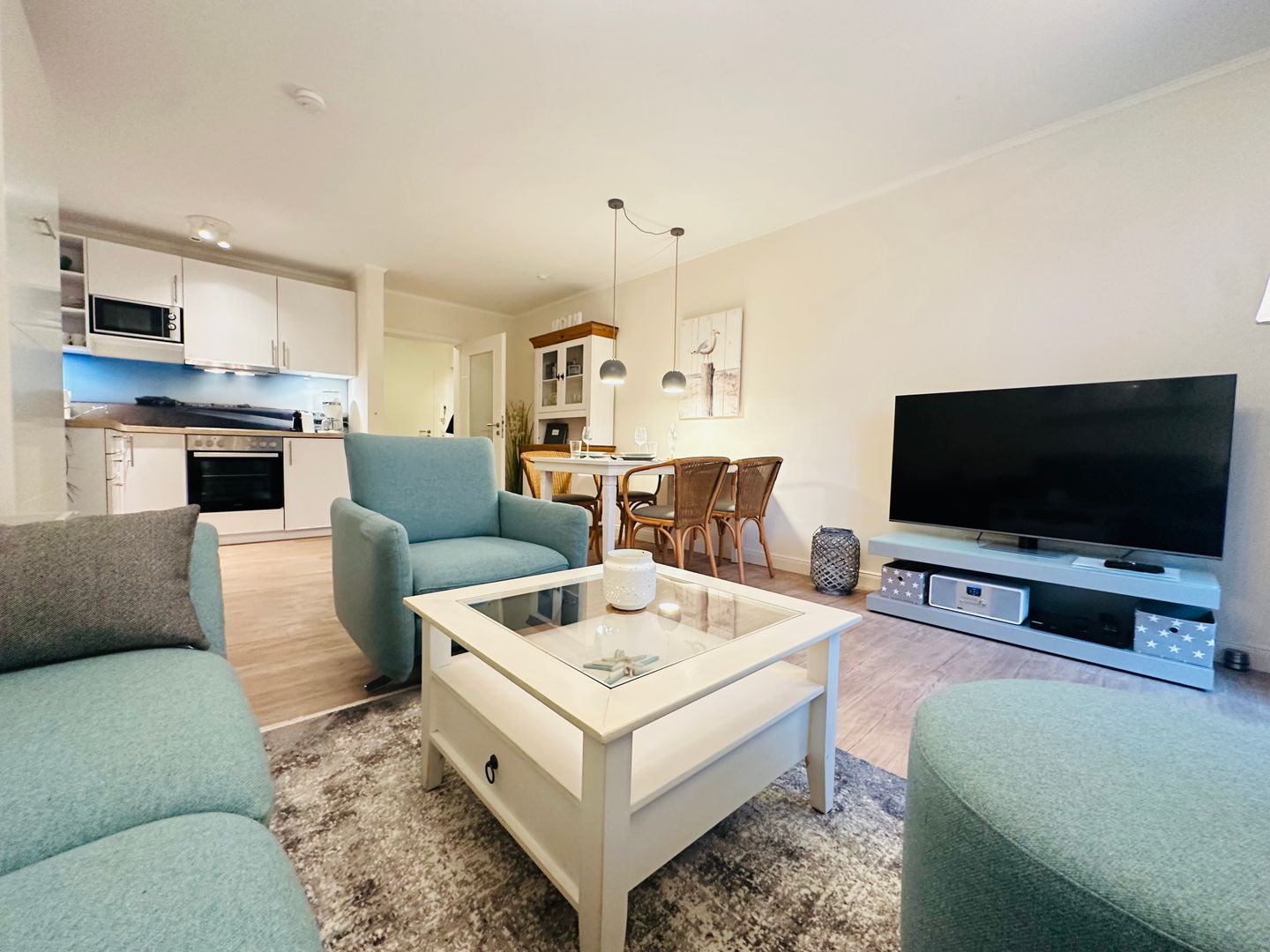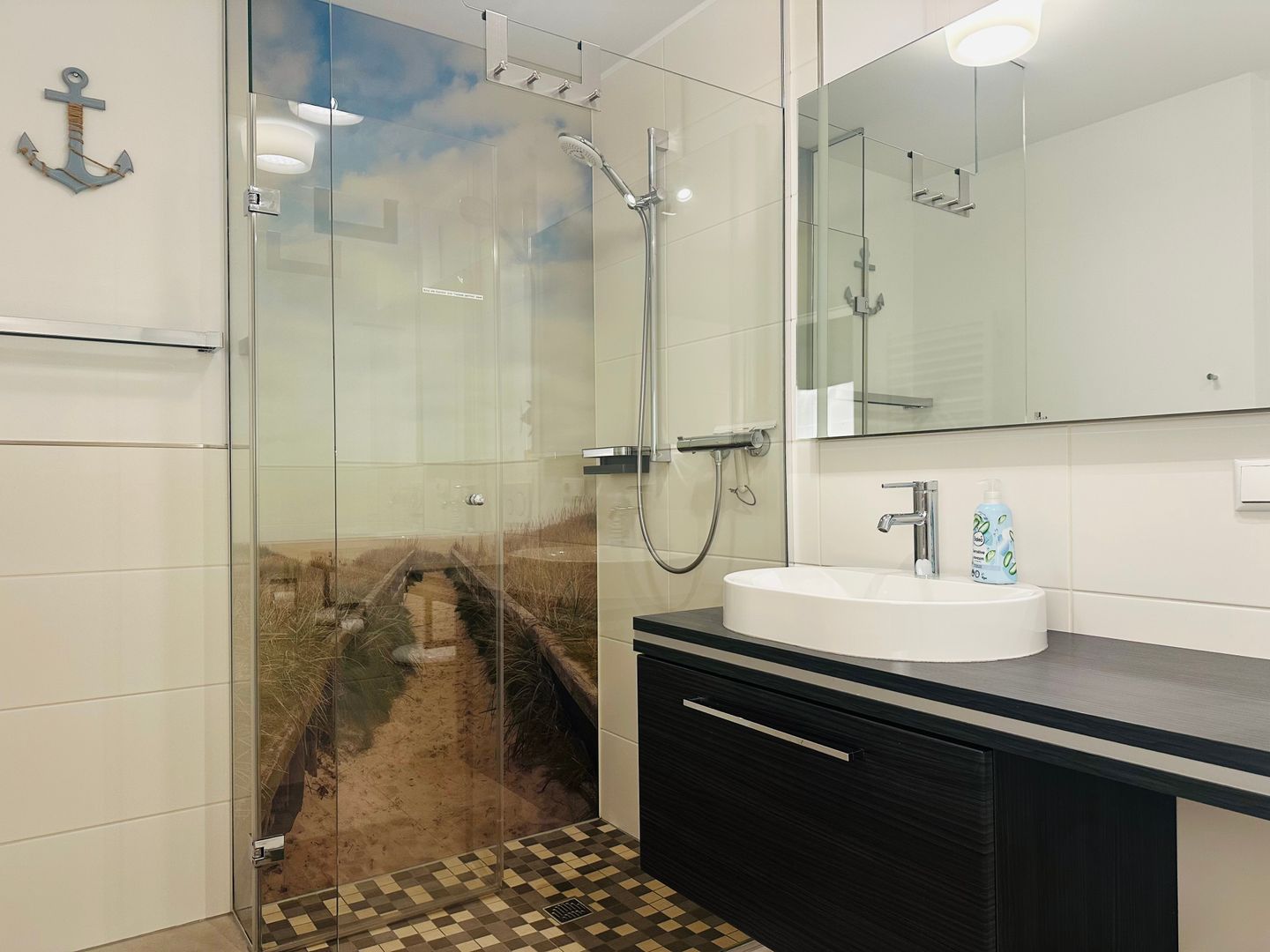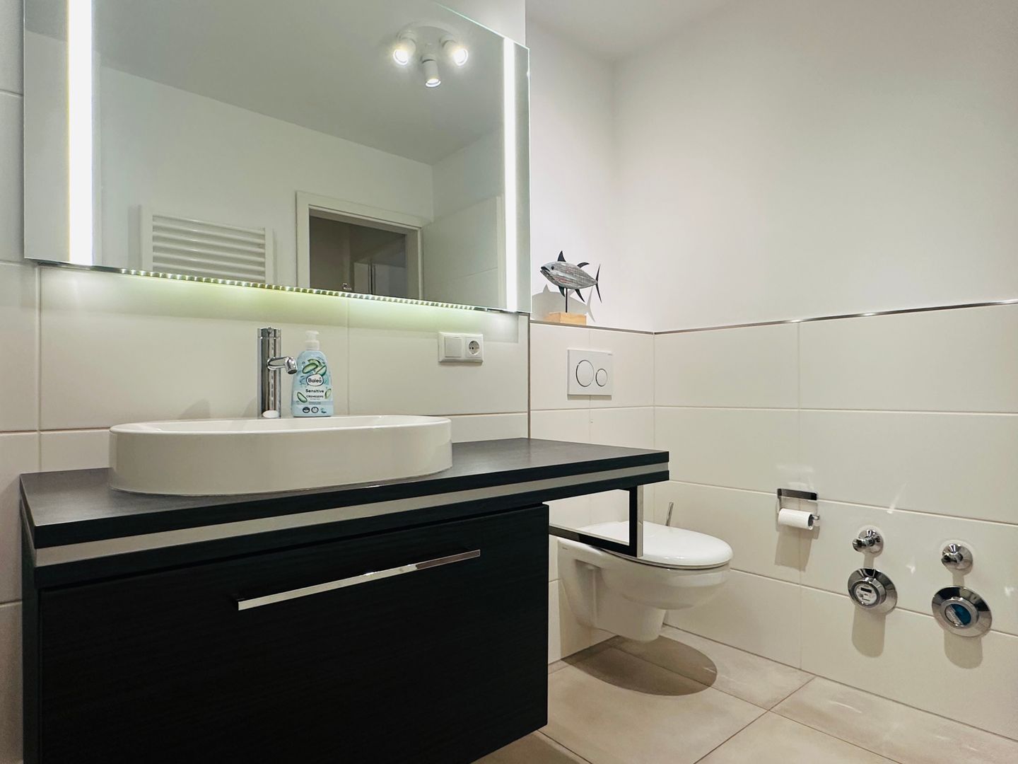 Die ca. 62 qm große Ferienwohnung im Erdgeschoss ist modern und hochwertig eingerichtet. Im Wohnbereich mit Essecke können Sie nach einem langen Tag entspannen. Die offene Küche macht das Kochen zum Vergnügen. Die Wohnung verfügt über ein Duschbad, ein weiteres WC mit Waschtisch und ein Schlafzimmer.