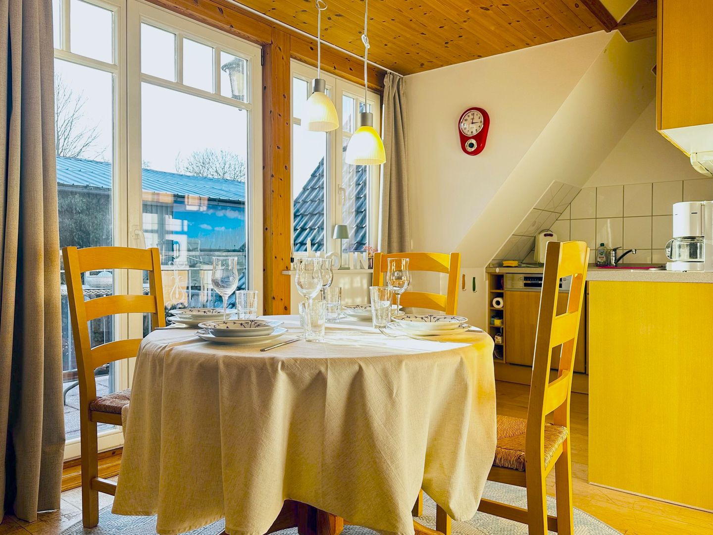 Die Wohnung verfügt über ein Schlafzimmer mit zwei Einzelbetten, die bei Bedarf zu einem Doppelbett zusammengeschoben werden können. Der offene Wohn- und Essbereich ist hell und freundlich gestaltet und integriert die gut ausgestattete Küche mit Kapselmaschine, Mikrowelle und Spülmaschine.