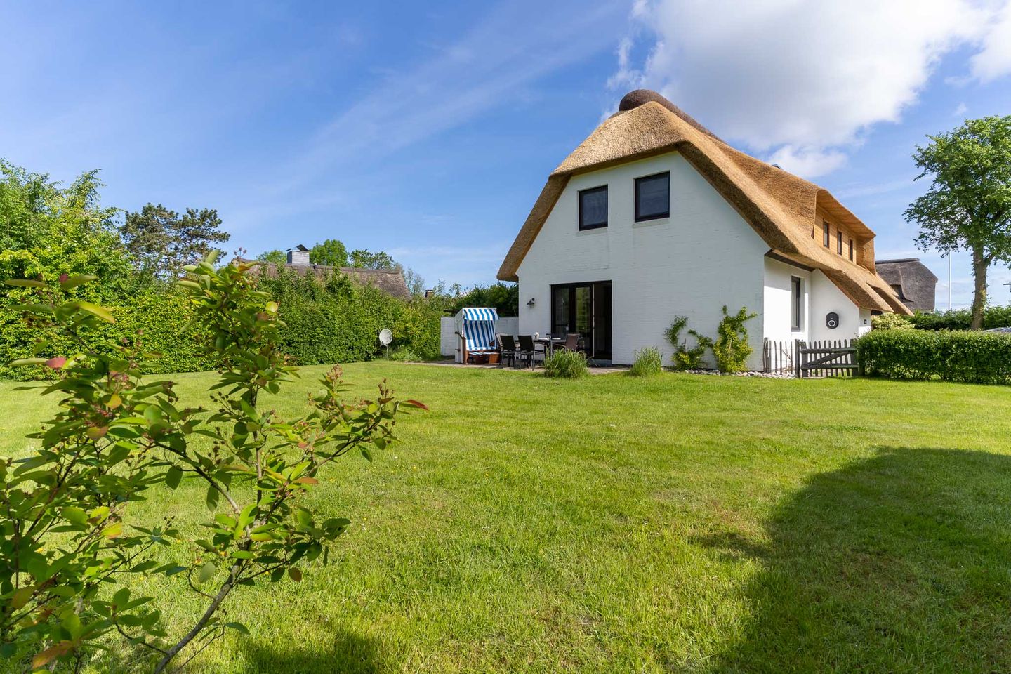Für viel Licht im ganzen Haus sorgen die großen Fenster. In dem großzügig angelegten Garten und den gemütlichen geschützten 2 Terrasse können Sie Ihren Urlaub ab der 1. Minute genießen. Gartenmöbel laden Sie zur Erholung ein.