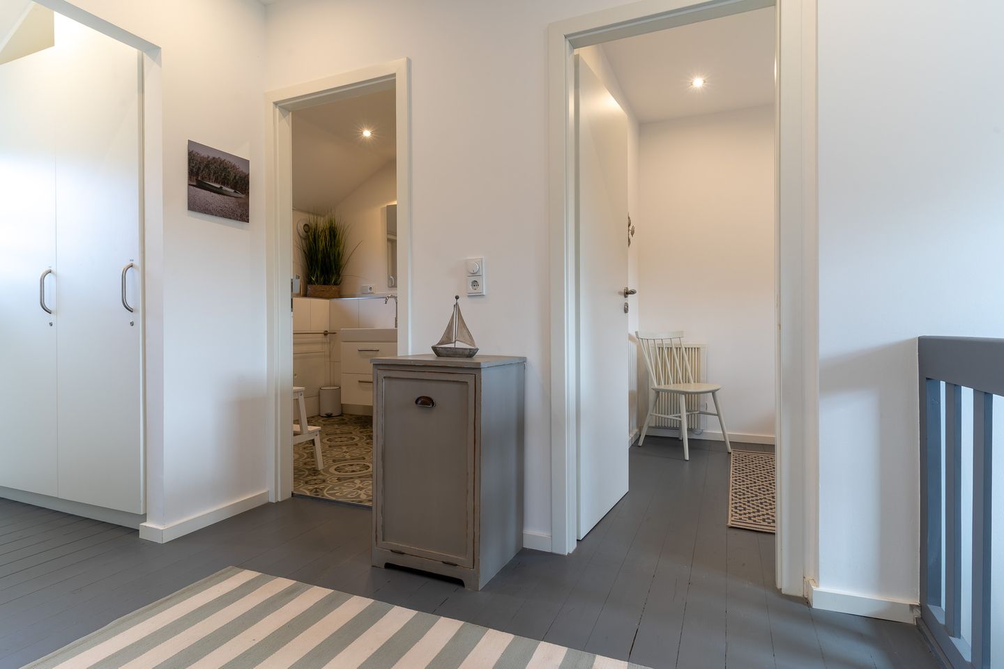 Im Obergeschoss ist ein Duschbad. Die Einbauschränke im Flur gewähren genügend Ablagefläche.